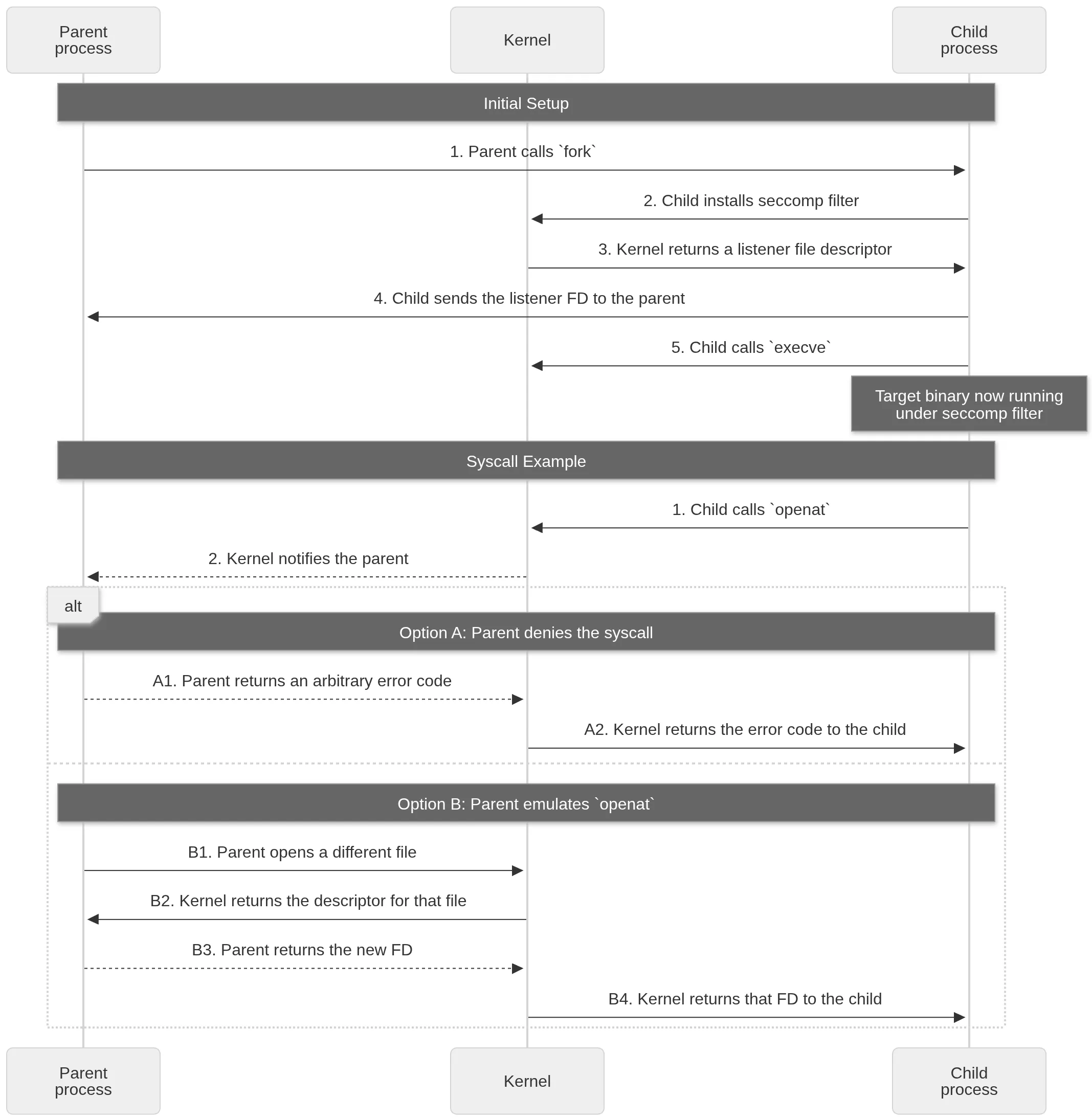 openat, the kernel notifies the parent process and waits for its response. The parent has a couple of options: A. The parent can effectively block the syscall by returning an error code withSECCOMP_IOCTL_NOTIF_SEND(id, error=-EPERM). B. The parent can also effectively emulate the syscall by callingopenatitself and then returning the result withSECCOMP_IOCTL_NOTIF_ADDFD(id, srcfd=<alt_fd>, flags=SECCOMP_ADDFD_FLAG_SEND)where “<alt_fd>” is replaced with an arbitrary file descriptor.