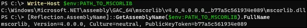appDomain->Load_2(SysAllocString(L"mscorlib, Version=4.0.0.0"), &mscorlib);If you’re attempting to patch a method outside of mscorlib, you must also load that assembly. If the system you are targeting has only one version of the .NET framework, you should be able to load mscorlib using its name alone. Specify the version or full name for production tools to ensure they load the correct assembly. You can retrieve the full name of an assembly on disk using PowerShell: