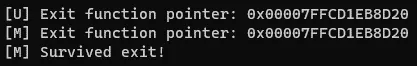 Console.WriteLine("[M] Survived exit!");Executing this assembly with the unmanaged host program from the POC repository should produce the following result. Both implementations locate the same address, and the .NET program successfully survives a call to Exit.